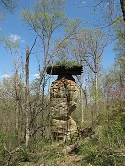 Jug Rock is a natural geological formation located outside of Shoals, Indiana, in the valley of the East Fork of the White River. It is composed of sandstone, and is the largest free-standing table rock formation (also called a "mushroom rock") in the United States east of the Mississippi River. It is part of the Mansfield formation, laid down in the Pennsylvanian geological epoch, roughly 325 to 286 million years ago. Erosion along fracture lines separated it from a nearby cliff. A companion feature, House Rock, stands opposite Jug Rock.