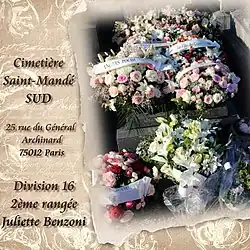 Juliette Benzoni died peacefully in her sleep on 7 February,[5] 2016 in Saint-Mandé, with, her daughter Anne at her side. In the book of condolence which was provided online, readers all over the world expressed their sadness [27] She is buried at the Cemetery in Saint-Mandè Sud, with her mother, husband and son.