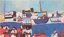 Barragán traveled to Paris, France, in the late 1940s, however, and was influenced by Georges Braque and Pablo Picasso. He joined the "Twenty Painters and Sculptors" group with his brother, Bruno Venier, and Oscar Capristo, among others. The group, active in Argentina between 1952 and 1963, exhibited works in a number of Abstract genres, although Julio Barragán's Concrete phase contrasted with much of the group's more surreal work. His style of painting then shifted to Cubism, adopting a chiaroscuro tone that would become his trademark. The landscapes and cityscapes he painted in subsequent decades were marked by Cubist and Impressionist influences.[2] These became his best-known works, and to meet growing demand, he adopted an "assembly line" routine at his Villa Urquiza atelier, whereby several easels were assembled in a row that allowed Barragán to alternate randomly from one work to another.[3]