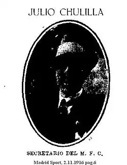 Julio Chulilla Gazol (2 February 1887 – 7 January 1960) was a Spanish footballer who played as a forward for Madrid FC.[1][2] He was one of the most important figures in the amateur beginnings of Madrid FC as a club founder in 1903, as a player for the team between 1905 and 1912, and then as secretary from 1912 to 1924, and even as the editor of Madrid Sport, the official organ of the club.[3]