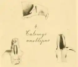 Winge's concept of the genus Calomys essentially included unspecialized species with pentalophodont molars, which are characterized by the presence of a crest known as the mesoloph on the upper and mesolophid on the lower molars, and excluded species now placed in Calomys, which he classified in Hesperomys instead.[9] Since 1898, authors have placed Winge's Calomys species in Oryzomys,[10] conforming to the more conventional taxonomic arrangement; after that, the species was referred to as Oryzomys anoblepas. Over many decades, the identity of most of Winge's species remained uncertain, and in many cases it was not until the 1990s that the original material was restudied to provide a definitive identification of the material.[11] In a 2002 review of the fossil sigmodontine rodents of South America, Argentinean zoologist Ulyses Pardiñas and his coworkers wrote that O. anoblepas was "possibly an Oecomys",[12] but this claim was based only on a cursory investigation.[13]