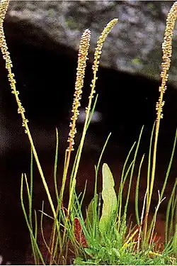 Juncaginaceae are marsh or aquatic herbs with linear, sheathing basal leaves. The flowers are small and green in erect spikes or racemes. The flower parts come in threes, but the carpels are either 3 or 6, joined to a superior ovary. The fruit is a capsule.[3] Example arrowgrasses Triglochin include the Marsh Arrowgrass (Triglochin palustris), the Sea Arrowgrass (Triglochin maritima), and also other species like Triglochin trichophora, Triglochin striata and Triglochin mucronata.