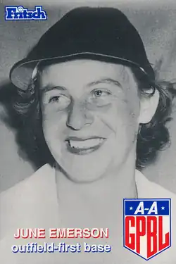 June Emerson (June 4, 1924 – October 1, 1990) was a Canadian baseball player who played in the All-American Girls Professional Baseball League. Listed at 5' 5", 135 lb., Emerson batted left handed and threw right handed. She was nicknamed Venus.[1][2]