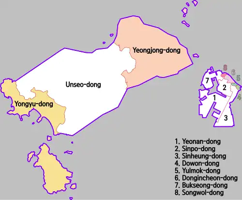 - Yongyu-dong, Yongyu Island (divided in turn into Eurwang-dong, Nambuk-dong, Deokgyo-dong and Muui-dong)