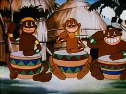 In a jungle, a primitive tribe of people with black noses and dark skin with light muzzles are going about their day, with the jungle elements being intertwined with modern-day gags; for example, the people dancing around a tent (in a style more reminiscent of Native American fire dances) when it turns into a makeshift merry-go-round, to the tune of "The Merry-Go-Round Broke Down", which promptly deflates and slows to a halt, and at least one of the denizens wears a top hat in resemblance of minstrel show stereotypes.