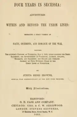 After the war, he served as correspondent of the New York Tribune, New York Times, and other journals, and contributed many articles to leading periodicals. His best-known works are Four Years in Secessia (1865), The Great Metropolis: A Mirror of New York (1869), and Sights and Sensations in Europe (1872). A series of articles on women, which he wrote for the Galaxy, created a sensation in literary circles. His Four Years in Secessia has descriptions of various incidents of the American Civil War and information concerning the conditions of the Southern prisons and the Northern soldier confined in them.