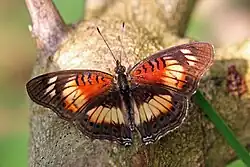 Junonia sophia, the little commodore or little pansy, is a butterfly in the family Nymphalidae. It is found in Senegal, the Gambia, Guinea-Bissau, Guinea, Sierra Leone, Liberia, Ivory Coast, Burkina Faso, Ghana, Togo, Nigeria, Cameroon, Angola, the Democratic Republic of the Congo, Uganda, Rwanda, Burundi, Kenya, Ethiopia, Tanzania, Malawi, and Zambia.[2] The habitat consists of forests and savanna.