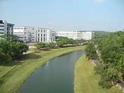 The two rivers also have extensions that flow into the mainland portion of the region. Sungei Pandan has a western branch, Sungei Ulu Pandan, which flows from Jurong East into the town of Clementi before cutting off at Queenstown located east of Clementi. Sungei Jurong channels out of Jurong Lake via a stream located west of the lake and Jurong Canal located directly north of the lake. The canal also serves as the boundary line between the towns of Jurong East and West.[4]