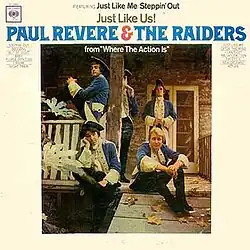 Just Like Us! is the fourth studio album by American rock band Paul Revere & the Raiders. Produced by Terry Melcher and released on January 3, 1966, by Columbia Records, it featured the U.S. hit single "Just Like Me". Unlike their later albums, on which Mark Lindsay was the primary lead singer, the lead vocal duties on Just Like Us! were split among him and the other band members, guitarist Drake Levin, bassist Phil Volk, and drummer Mike Smith.[1] This was their last album of cover songs, their next album Midnight Ride was mostly self-penned material.