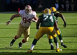 Smith was selected for five consecutive Pro Bowls from 2009 to 2013.[6] In 2011 and 2012, he was named to the Associated Press All-Pro team both as a Defensive End and as a Defensive Tackle. He was eligible for the honor at both positions because the 49ers used him as a defensive end in their 3–4 base defense, while frequently moving him inside to DT for their 4–2 nickel defense.[7] He had been mentioned by many pundits as a candidate to win the 2011 NFL Defensive Player of the Year Award, and finished third with 6 out of 50 votes.[8]