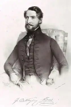 Count Kázmér Antal Ferenc Batthyány de Németújvár (3 June 1807 – 13 July 1854) was a Hungarian politician, who served as Minister of Foreign Affairs during the Hungarian Revolution of 1848. At the beginning he was a conservative aristocrat politician but his views changed after a journey to Western Europe. He gradually became liberal and learnt the Hungarian language. In the House of Magnates of Hungary he supported the reforms of the industry and traffic. He also supported the protection of Hungarian products and the liberation of the serfs.