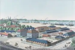 In 1878, due to shortage of space and fear of cholera epidemics, the City decided to construct a new cattle market. A municipal committee suggested a location at Kalvebod Beach, which at the time was situated where the square Halmtorvet (English: Haymarket) is today. The site was located on the grounds of a large estate which the city had acquired from the Royal Copenhagen Shooting Society in 1870. The new cattle market was constructed partly on an area previously occupied by shooting ranges, partly on new land reclaimed along Kalvebod Beach.[2]