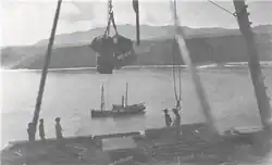 The second, also 3 miles (5 km) long line led from the sugar mill to Kahili Landing, where the packaged, ground sugar was loaded onto the steamers anchored at Mo'ko'lea Point using a wire rope winch.[1] It started halfway on Kilauea Road, then northwards and eastwards to Makanaano Square and ended at Kahili Landing above Mo'ko'lea Point. There the ships anchored to be loaded with 125 pounds (57 kg) sugar bags each.[3] The operations at Kahili Landing and on the railway line leading there were abandoned in 1928, whereupon the sugar was transported from the sugar mill to Ahukini Landing for shipment.