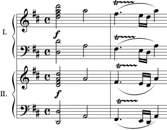 The Sonata for Two Pianos in D major, K. 448 (375a), is a work composed by Wolfgang Amadeus Mozart in 1781, when he was 25. It is written in sonata-allegro form, with three movements. The sonata was composed for a performance he would give with fellow pianist Josepha Auernhammer.[1] Mozart composed this in the galant style, with interlocking melodies and simultaneous cadences. This is one of his few compositions written for two pianos.
