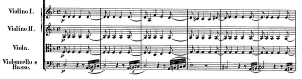 The first movement starts off the concerto in the tonic key of D minor with the strings restlessly but quietly building up to a full forte. Music critic Michael Steinberg calls this opening as "all atmosphere and gesture–no theme".[2] It is then followed by the second theme, played by the woodwinds before being overtaken by the tutti orchestra.[7]