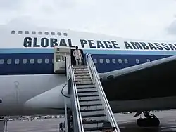 Through charitable contributions to his organization, Paul's backers provided funds to purchase a Boeing 747SP airplane that Paul named "Global Peace Ambassadors", which flew under the name "Global Peace One".[21] The airplane was formerly flown by China Airlines; it was the aircraft in the China Airlines Flight 006 accident. The airplane was used for missions to Third World countries, delivering disaster aid. A former crew member described it as a "flying death trap". The volunteer pilot, first officer, and flight engineer all quit in 2010 because of concerns over maintenance and non-payment of debts. The FAA eventually suspended the plane's operating certificate due to insufficient maintenance.[22] The aircraft is parked at Tijuana International Airport in Tijuana, Baja California, and is reported to be in poor condition. The airplane's registration N4522V was cancelled by Federal Aviation Administration on March 14, 2018 due to expiration.[23]