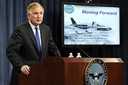 On 9 July 2008, the Defense Secretary Robert Gates put the tanker contract in an "expedited recompetition" with Defense Undersecretary John Young in charge of the selection process instead of the Air Force.[6] A draft of the revised RFP was provided to the contractors on 6 August 2008 for comments with the revised RFP to be finalized by mid-August. Proposals would be due in October 2008 and selection was to be done by the end of 2008.[32][33][34] In mid-August, there was speculation that Boeing was considering a "no bid" position.[35] On 21 August 2008 Boeing asked the DoD for an additional four months to submit a proposal centered on a larger aircraft,[36] but they opposed further delay.[37] Then on 10 September 2008, Defense Secretary Robert Gates decided that the new competition could not be fairly completed before the end of 2008. The DoD canceled the request for proposals and delayed the decision on when to issue another request until the new presidential administration was in office.[7][38][39][40]