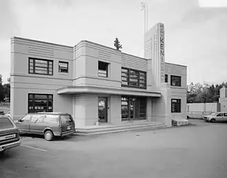The reinforced concrete two-story building was owned by Cap Lathrop, who had worked with Porreca on Lathrop's Fourth Avenue Theatre. Besides radio station facilities, the building also housed three apartments.[2]