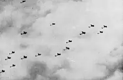 II Gruppe also trained for long-range operations under the command of IV Fliegerkorps. It was brought up to strength with 35 H-16s at Dęblin: where it remained based until 10 May 1944.[84] It trained from January to March 1944. From 31 March to 7 April 1944, it dropped supplies to the Kovel pocket, and rendered support to the 5th SS Panzer Division Wiking.[84] It flew rail interdiction; bombing yards at Rovno, Kiev and Shepetovka from 4–11 May. It joined I Gruppe at Focsani in Romania to evacuate the Crimea, from 11 to 16 May 1944.[84] It moved back to Dęblin but the fuel crisis now prevalent in the Luftwaffe, slowed down the pace of operations. On 21/22 June, with I. and III. Gruppen, it bombed Poltava Air Base, which housed United States Army Air Force bombers that had been flying shuttle-missions to Eastern Europe and landing in the Soviet Union. The raid caused significant losses to the US Fifteenth Air Force.[102] A Heinkel He 177 from 2./Aufklärungsgruppe 100 shadowed the 3rd Bombardment Division, 45th Bombardment Wing to Poltava.[103] The raid, carried out by KG 55, KG 53, KG 27 and KG 4, destroyed 43 B-17 Flying Fortress' damaged 26, and destroyed 200,000 US gallons of aviation fuel.[104]