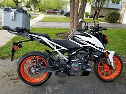 The KTM 200 Duke is a 199.5 cc (12.17 cu in) single-cylinder standard motorcycle made by KTM since 2012.[1] It has a four-stroke, spark-ignition liquid-cooled engine. It has six-speed gearbox and a cable actuated multi-disc clutch. The bike has an underbelly exhaust and a three-chamber silencer positioned close to its centre of gravity.
