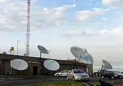 Side entrance to the KTVO newsroom and the large number of satellite dishes used by the station.
