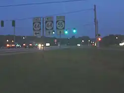 Kentucky Route 55 Business (KY 55 Business) is a business route of KY 55 in Shelbyville. The highway runs 5.150 miles (8.288 km) between junctions with US 60/KY 55 west of Shelbyville and KY 55 north of Shelbyville. The route was formed in 2010 with the completion of the Shelbyville Bypass (Freedom's Way), which re-routed KY 55 around Shelbyville.[3] The old route that passed through Shelbyville became KY 55 Business. For the first 3.074 miles, the route forms a concurrency with US 60 and is a four-lane highway. From its origin, it passes through a commercial area of Shelbyville with many businesses and shopping centers lining the roadway. Roughly 1.3 miles (2.1 km) from its origin, KY 55 Business splits into two one-way routes, Main Street going west to east, and Washington Street going east to west. Here it also forms a concurrency with KY 53. The route passes through downtown Shelbyville and the one-way routes join just east of downtown. The route then departs with US 60 and KY 53 and turns north and becomes a two-lane highway, passing by multiple businesses and subdivisions. After intersecting KY 43 and KY 2268, it continues north for roughly 0.8 miles (1.3 km) before ending at KY 55 north of Shelbyville.