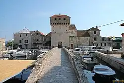 Due to the Turkish threat, Benedictine nuns completed the construction of a fortified settlement Kaštilac on the islet of Gomilica in 1545. Entrance to the castle is protected by high tower over the stone bridge with arches. Kaštilac is 40 metres (130 ft) away from the shore, connected with the stone bridge,[2] which was made only of stone. Fortress has square floor plan and in the past, at the entrance was located drawbridge. After the fortress was completed, within the fortification walls arrived inhabitants of the Upper and Lower Kozica, after the Turks had devastated their former villages. In the 17th century the tower lost its defensive function.