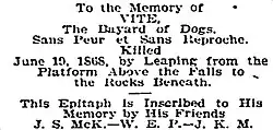 On the left side of the falls, halfway between the middle and top level there is a worn engraving that is dated 1868. It is dedicated to the "Bayard of Dogs" "A tragic story of a dog's devotion to his master, even unto death, is graven deep on a tablet hewn in the face of a rock beside the Kaaterskill Falls at the time of its occurrence."[4] Local legend suggests that on June 19 of every year, the spaniel haunts the vicinity of the falls and "as the hands of the clock mark the witching hour, a succession of short, sharp barks is heard followed by the flight of the apparition through the air over the falls into the precipice, whence arises a prolonged howl which echoes and re-echoes among the Cimmerian recesses of Sunset Gorge and the forest clad slope of High Peak Mountain"[4]