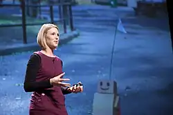Kacie Kinzer (born 1983)[1] is an American designer and interactive artist.[2] Her best known works are a series of cardboard "tweenbots", which were designed to get help from people, in order to complete their mission: crossing Washington Square Park.[3][4][5] The bots were collected by the Museum of Modern Art and part of an exhibit on Design and Communication during 2011.[6] Kinzer spoke at PopTech in 2009.[2]