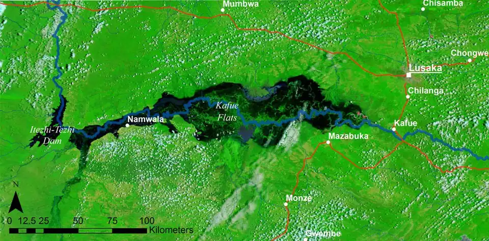 The hydrology of the Kafue River and Kafue Flats have been significantly altered by the construction in the 1970s of two dams, firstly at Kafue Gorge downstream of the flats and then at Itezhi-Tezhi upstream of the flats as parts of a scheme to generate hydroelectric power.