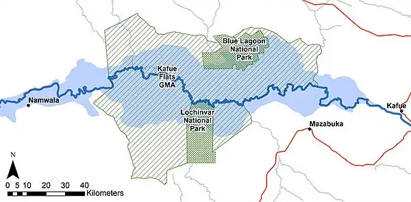 The Kafue Flats were entered onto the Ramsar list of Wetlands of International Importance in 1991 covering an area of 6,000 km2 (2,300 sq mi) coincident with the Kafue Flats GMA.[13]