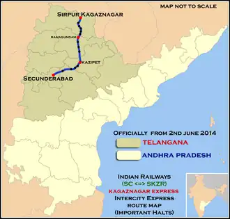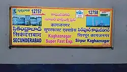 The 12757 / 12758 Kaghaznagar Superfast Express is a Superfast Express train belonging to Indian Railways – South Central Railway zone that runs between Secunderabad Junction & Sirpur Kaghaznagar in India.