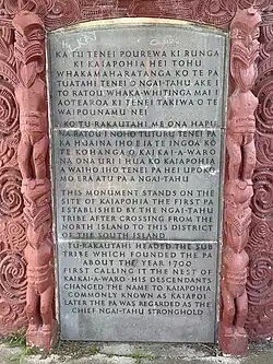 THIS MONUMENT STANDS ON THE SITE OF KAIAPOHIA THE FIRST PA ESTABLISHED BY THE NGAI-TAHU TRIBE AFTER CROSSING FROM THE NORTH ISLAND TO THIS DISTRICT OF THE SOUTH ISLAND