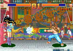 Another unique feature is that it introduced the power zones, which can be utilized via a successful hit of a special move when a player's "Crush Meter" is full. The power zones (either fire or electric) can also affect a certain special move that a character has. Backgrounds can be destructible when players get hit to charge up, and when those meters are full, the next special move that a player connects with an opponent will destroy the background's properties at will (other parts of stages, such as floors and walls are also destructible).