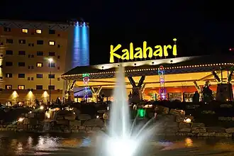 Kalahari Resorts and Conventions Poconos is a water park, resort hotel, and convention center located in Pocono Manor, Pennsylvania. The resort broke ground on October 1, 2013 with several executives from the Kalahari Resorts chain along with Pennsylvania state governor Tom Corbett in attendance.[1] The resort opened on July 1, 2015 and features 220,000-square-foot (20,000 m2) indoor water park, an outdoor waterpark, 230,000-square-foot (21,000 m2) convention center, 977 guest rooms, and a 40,000-square-foot (3,700 m2) arcade and entertainment center.[2]