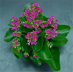 Kalanchoe (/ˌkæləŋˈkoʊ.iː/ KAL-əng-KOH-ee),[2][3] (also called "kalanchöe" or "kalanchoë"), is a genus of about 125 species of tropical, succulent plants in the stonecrop family Crassulaceae, mainly native to Madagascar and tropical Africa. A Kalanchoe species was one of the first plants to be sent into space, sent on a resupply to the Soviet Salyut 6 space station in 1979.[4] The majority of kalanchoes require around 6–8 hours of sunlight a day; a few cannot tolerate this, and survive with bright, indirect sunlight to bright shade.