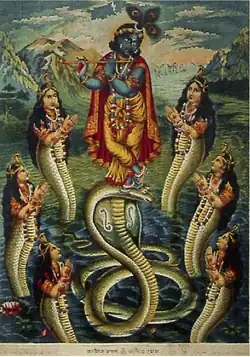 Kaliya (IAST: Kāliya, Devanagari: कालिय), in Hindu traditions, was a venomous Nāga living in the Yamunā river, in Vṛndāvana. The water of the Yamunā for four leagues all around him boiled and bubbled with poison. No bird or beast could go near, and only one solitary Kadamba tree grew on the river bank. The celebration of Nāga Nathaiyā or Nāga Nṛitya is associated with the tale of Krishna dancing upon and subduing Kāliya.