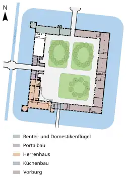 The courtyard façades of the castle are all very plain and give the impression of an estate rather than a princely residence.[104] The only special feature of the inner courtyard are three Linden ring, which take up three quarters of the courtyard area. The fourth area, facing the manor house, is designed as a paved driveway courtyard. The trees were planted in 1825 according to plans by Weyhe.[105]