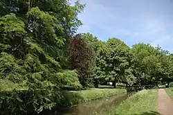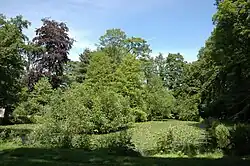 Of the palace park laid out by Maximilian Friedrich Weyhe, the basic structures of the semi-circular English landscape garden on the west side, the northern compartments and the basic layout of the southern kitchen garden are still preserved today. In the park, whose grounds rise and fall in undulating lines, there are mostly native trees and only a few exotic species.[119] For example, the avenue leading up to the west portal is lined with lime trees. Two smaller, curved paths branch off from this access road in the central axis and lead around the landscape park, which is bordered on the outside by hedges and woodland planting, until they meet the canalized Schwarzbach stream at the southwest and northwest corners of the castle and cross it by means of small bridges. The Schwarzbach feeds the castle moat and the northern castle pond. Coming from Wülfrath, it enters the palace park in the south, crosses it by flowing a long way parallel to the western palace moat - separated from it only by a dam with a narrow path - to flow into the Rhine north of the palace park at Wittlaer. On the southern edge of the park is the ice cellar, which dates back to the beginning of the 19th century and still has an entrance. Nearby, in the area of the south-western park meadow, there is a small mound with masonry. These are the remains of the shooting range established in 1819. On the opposite northern edge of the park, there is still the artificially heaped up Tempelberg, whose small Chinese wooden temple is no longer preserved.