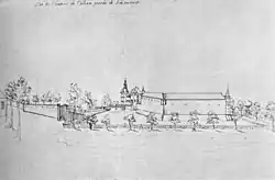 Ludger had the old Gothic Wasserburg into a representative Baroque castle by 1663, partly using the old building fabric. The stately residence at the south-west corner of the complex, known as the Oberhaus[21] was not only given large rectangular windows and a new roof, but a square corner tower with a curved hood and lantern was also added to its two wings, which abutted at right angles. However, the main focus of the work was on enlarging the outer bailey buildings. Ludger had the old farm buildings completely demolished and then had a new four-winged outer bailey built,[21] which was more than twice as large as its predecessor. Together with the manor house, the castle now had the quadrangular ground plan it still has today and was surrounded by a newly dug moat. A drawing by the Walloon Renier Roidkin from around 1720/1730 shows Kalkum Castle after the conversion and extension work. The building stock at that time included a castle chapel to the north of the two-storey manor house. A ridge turret depicted on the Roidkin drawing points to this building, which no longer exists. In addition, a stone foundation found in the corresponding place suggests an altar.[22] At the north-east corner of the outer bailey stood a polygonal corner tower with a double-curved Baroque dome, which is no longer preserved today. A wooden bridge led over the southern moat to a square tower with a gate.