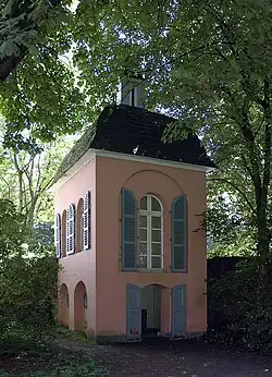 At the edge of the southern moat on the eastern enclosure wall is a small orangery, which replaced the large orangery built under Weyhe. It was completely overhauled in 1965/66.[77] The former garden pavilion, also known as the summer house and tea house, leans against the eastern wall from the inside. Like the castle, the small tower-like plaster building is painted pink and is topped by a baroque dome with a lantern. Its exact date of construction is unknown, but it may date back to plans by Georg Peter Leydel What is certain is that it was not built in connection with Maximilian Friedrich Weyhe's park plans,[119] but already existed at the time. During the major renovation work in the first half of the 19th century, work was carried out in the pavilion several times. For example, it was painted by Ludwig Pose, who was also responsible for the wall and ceiling paintings in the manor house.[120] The garden house was converted into a memorial to Ferdinand Lassalle in 1975 to mark the 150th anniversary of his birth. The interior of the building is designed as a cenotaph. A block of green Italian marble has the shape of a sarcophagus, above which stands the bust of Lassalle on a marble corbel. On the northern outer wall of the pavilion, plaques made of the same marble hang in two shallow niches with a quote by Ferdinand Lassalle as well as data on his life and work.