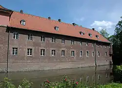 The lords of Kalkum rebuilt their burnt-down manor house after the end of the feud. A map from around 1600 shows it as an ensemble of three houses connected by corridor-like buildings, which were surrounded on all sides by a common moat.[16] However, the estate did not remain in the possession of the lords of Kalkum for much longer, as the line of Kalkum died around the middle of the 15th century.[16] Around the middle of the 15th century, the male line of the family based in Kalkum died out and the castle was inherited by the von Winkelhausen family, whose ancestral seat, the Haus Winkelhausen, was located a few kilometers north of Kalkum.[16] It is still not clear exactly when this happened. There is documentary evidence that Grete von Kalkum gave her estates in parish Kalkum to Hermann von Winkelhausen in 1443. This could also have included the Kalkum house.[17] There is evidence that the castle was owned by Winkelhausen in 1465, as in that year Herrmann von Winkelhausen designated Kalkum as a widow's residence for his wife Agnes on October 27.[18] In the 17th century, the estate was also used several times to provide for widowed members of the family. After inheriting the estate in the 15th century, the von Winkelhausen family moved their permanent residence to Kalkum. Around 1500, the owner was Johann von Winkelhausen. The estate passed from him to his son Ludger and finally to his nephew of the same name in 1556. This Ludger von Winkelhausen was jülich-Berg councillor, equerry and marshal as well as bailiff of Hückeswagen, Bornefeld and Mettmann.[12][19] In 1553, his family was also elevated to the baronial rank by privilege of Emperor Ferdinand III.[20]