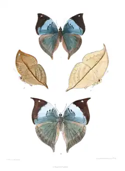 Kallima horsfieldii, the blue oakleaf,[1] southern blue oakleaf[2] or Sahyadri blue oakleaf,[3] is a nymphalid butterfly found in India.[2][1] The underside appears like a leaf complete with midrib while the upperside is brilliantly coloured.