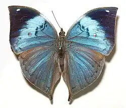Kallima philarchus, the Ceylon blue oakleaf, is a nymphalid butterfly found in Sri Lanka.[1] With wings closed, it closely resembles a dry leaf with dark veins and is a spectacular example of camouflage.