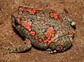 This plump species of frog attains a snout–vent length of about 75 millimetres (3.0 in), with females being slightly larger than males. The colour of the dorsal surface is greyish-black with a symmetrical pattern of reddish-brown patches on either side including a band of colour stretching from the back of the eye to the base of the arm. The underparts are pale yellowish-grey, mottled with black or brown. During the breeding season, males develop a dark throat patch.[3]