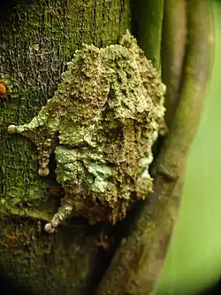 This species is distinguished from others in the genus by the presence of webbing between all the fingers and fully webbed toes as well. A fringe of skin is found along the outer edge of the fore and hind limbs. The tongue has a pointed papilla. The snout to vent length varies from about 3 to 3.5 cm and the colouration makes it cryptic among lichen and moss patches on tree trunks. The skin has projections making it appear rough.[3]