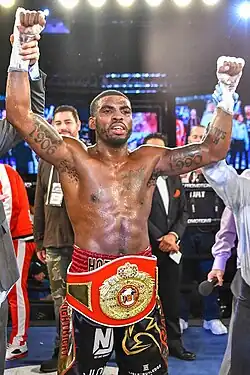 Henderson would then go on to win nine more fights between August 2016 and September 2018, bringing his record to 10 wins and 0 losses, including five TKO victories, before facing Brandon Robinson for the vacant Universal Boxing Federation inter continental super-middleweight title on December 7, 2018, at the 2300 Arena in Philadelphia.[10] He would win the fight in the seventh round, knocking Robinson to the canvas twice, first with uppercut, and again with an overhand right before the referee stopped the fight, declaring a TKO victory for Henderson.[11] The title victory for Henderson, which was considered an upset by commentators,[12] earned him the Bennie Briscoe Philly Fight of the Year award.[13]