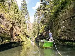 There are three navigation sections in the gorge: Edmund Gorge (Czech: Edmundova soutěska; also called Quiet Gorge or Tichá soutěska), Wild Gorge (Divoká soutěska) and Ferdinand Gorge (Ferdinandova soutěska), but only the first two are open to tourists. The operation is carried out by ferrymen who steer the ship with a tiller. The Wild Gorge represents the most valuable and best preserved part of the Bohemian Switzerland National Park.[1]