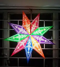 In the state of Kerala, especially in Fort Kochi, a city in Ernakulam District, it is known as akasha vilakku. Hindu Vaishyas (Konkani-speaking linguistic minority of Kerala), who had escaped from Goa during the Goa inquisition carried out by the Portuguese invaders, dwelt in Kerala. During the Hindu lunar month of 'Kartika', people used to put akasha deepam, colloquially known in the Konkani dialect as panjire, on rooftops, and light them at night until break of dawn in the nights leading up to the Karthika Paurnami (full moon) day or Dev Dewali day. Earlier, oil lamps were used, which were attached to the panjire; now coloured electric lights are used instead. By lighting the panjire it is believed that during Kartika, the spirits of the dead visit their relatives' houses to wish them well; or that if they are not lit, the dead will curse their relatives to live in darkness through life. Kindeels are hung for around a month from the first day of Diwali. Kandeels are traditionally built in a crystal shape with tails at the bottom; shapes include stars, globes, delicate dotted designs, and simple drawings. Opaque papers cut into a complex design give more beauty to a Kandeel by blocking some of the light behind it.