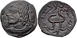 The Kangju were in frequent struggles with the Wusun, during which they in the mid 1st century BCE allied themselves with the northern Xiongnu.[2] The Kangju ruler gave his daughter in marriage to the northern Xiongnu ruler Zhizhi, while the Kangju king married the daughter of the Xiongnu ruler.[20] The Xiongnu and Kangju were initially successful, besieging the Wusun in 42 BCE. The Han however intervened, defeating and killing the northern Xiongnu ruler in at Talas in 36 BCE (Battle of Zhizhi). The Kangju ruler was subsequently forced to send his son as a hostage to the Han court.[2] Nevertheless, the Kangju continued to send embassies to the Han court and pursued an independent policy, which they were able to maintain until the 3rd century CE. Evidence of Kangju independence can be seen in the coinage issued in the 2nd and 3rd centuries CE, during which they issued their own currency which was similar to that of Khwarezm.[2]